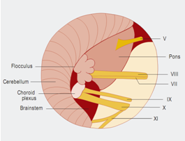Figure 5小脑桥脑角区解剖示意图:Ⅴ=三叉神经;Ⅷ=蜗神经;Ⅶ=面神经;Ⅸ=舌咽神经;Ⅹ=迷走神经;Ⅺ=脊附属神经。