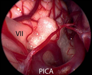 临床上通过在血管和脑干间的位置放置一个聚四氟乙烯海绵达到去压迫的目的(figure 7)。在一些复杂案例中(例如患者的血管直径过大或者血管硬化),则需要使用聚四氟乙烯吊索把产生压迫的血管缝合到硬脑膜上,这样才能够完全去除压迫。