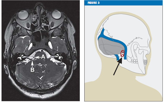 临床特征对于面肌痉挛的诊断至关重要。能帮助诊断的其他方法包括肌电图(EMG)[13]和核磁共振成像(MRI)。核磁共振成像(MRI)还是一个很有用的工具,它可以排除小脑桥脑角中的病理性改变,如肿瘤和脑干损伤。高分辨率T2-序列(注:一种核磁共振技术的术语,是一种成像序列)对显示可能的血管压迫非常有效,如轴面剥离稳态构成干扰(CISS)序列,这样就可以看到脑脊液、神经、和血管的高分辨率的视野(figure 2)。