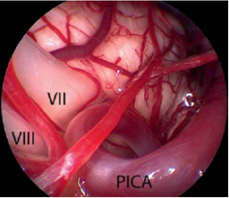 Figure 4内窥镜图像(使用30°内窥镜拍摄)显示了出脑干区的蜗神经和面神经的临近部位,它们被小脑后下动脉(PICA)环所压迫(与figure 2是同一患者)